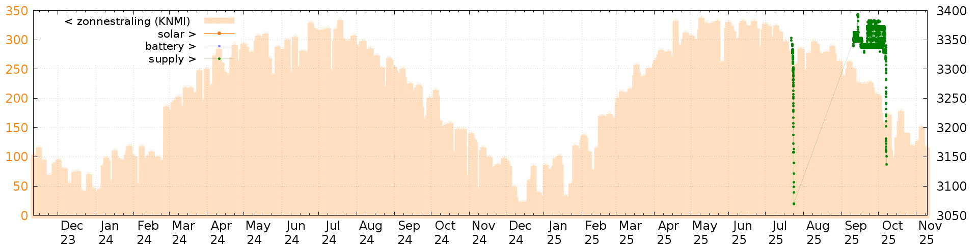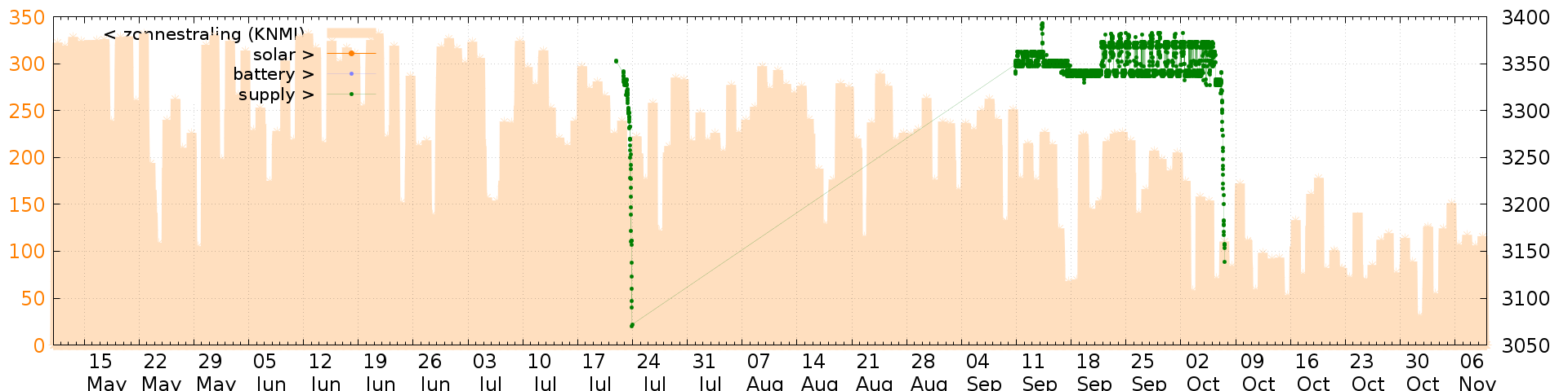 Battery and solar voltage measurements of the last 6 months: