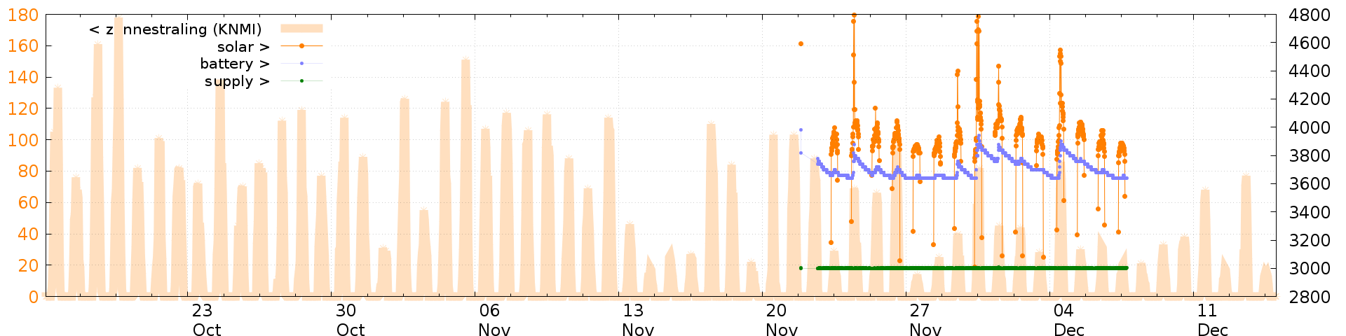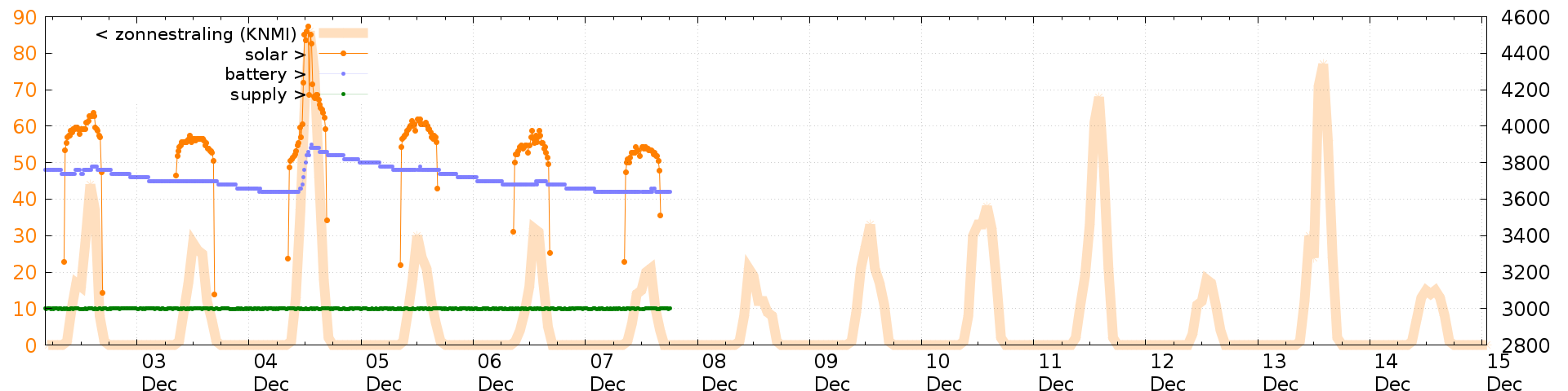 Battery and solar voltage measurements of the last 2 weeks: