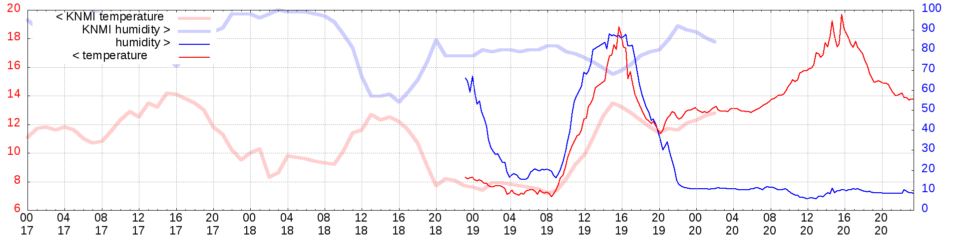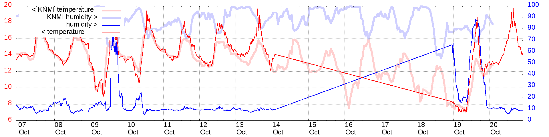 Temperature and humidity measurements of the last 2 weeks:   raw  calibrated  knmi   Plot   Graph