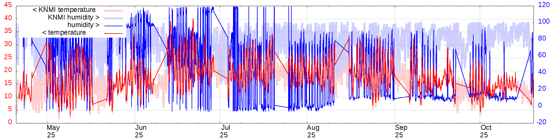 Temperature and humidity measurements of the last 6 months:   raw  calibrated  knmi   Plot   Graph
